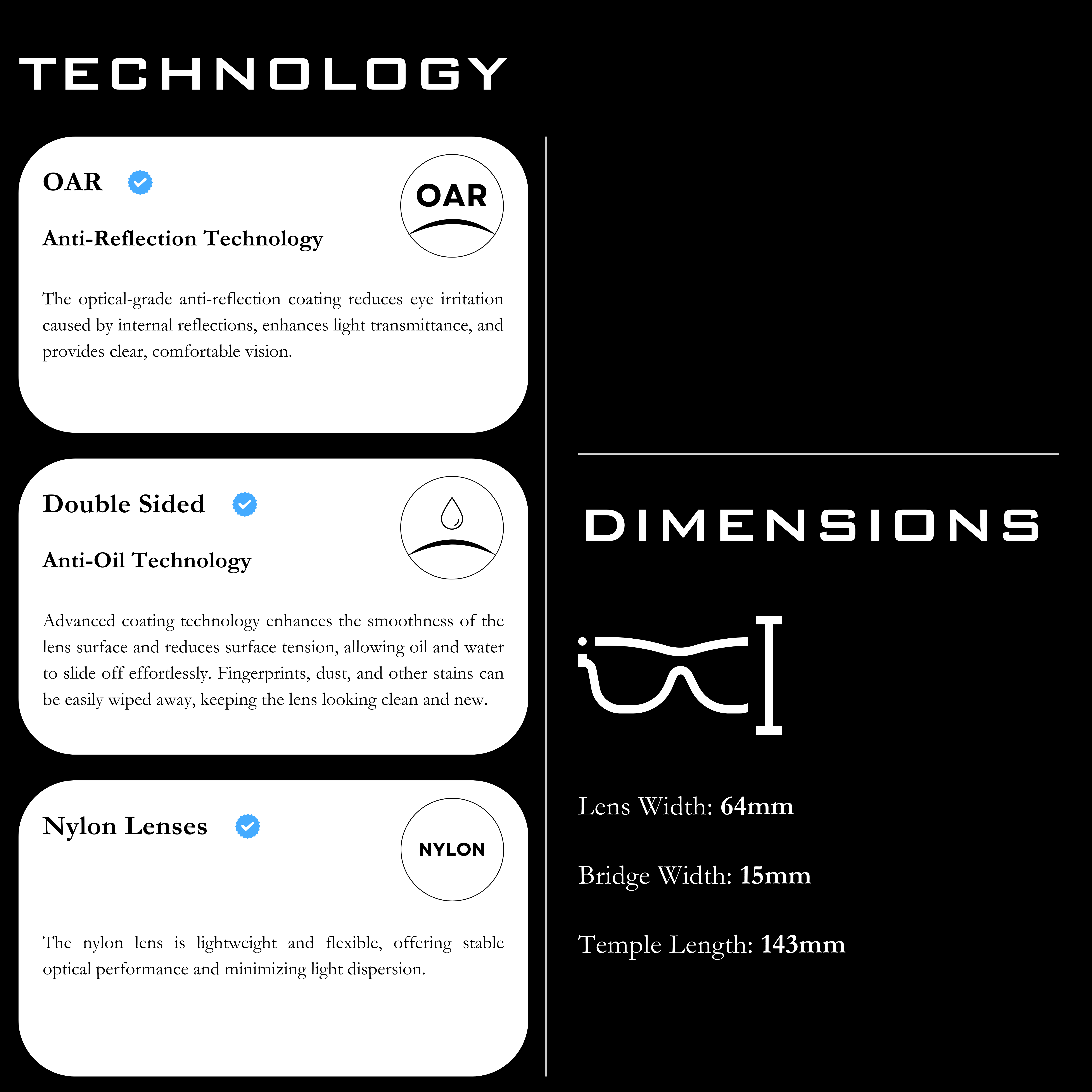 Double-Sided Anti-Reflection (OAR): This optical-grade coating reduces eye irritation caused by internal reflections. It enhances light transmittance, giving you a clear, comfortable view even in high-glare environments.