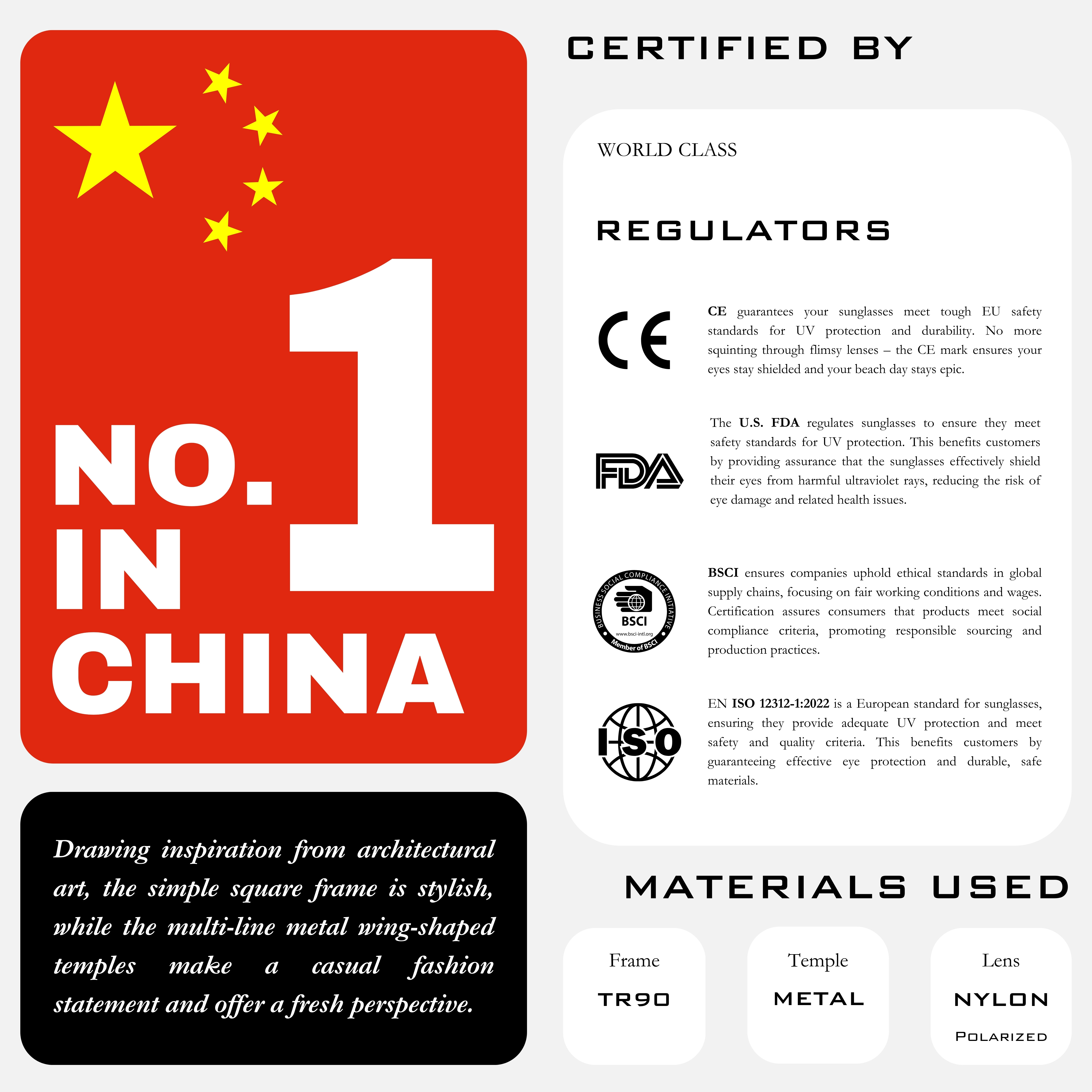 These sunglasses provide total peace of mind through strict compliance with global standards: